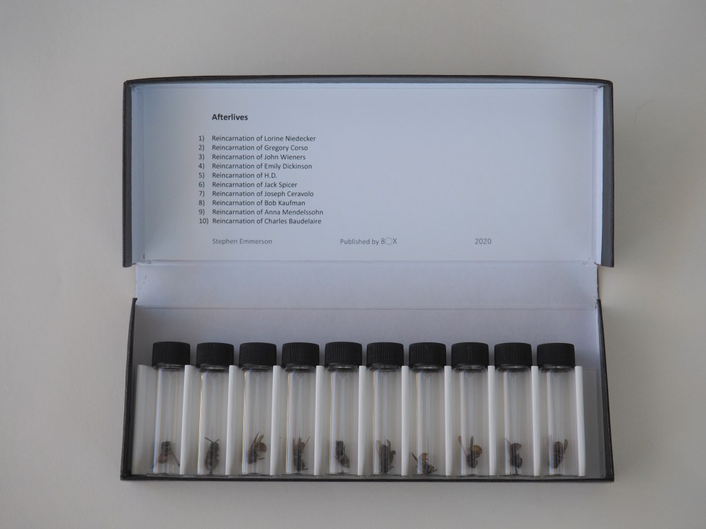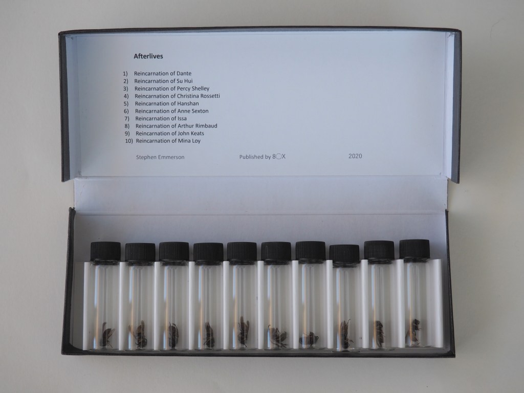 Afterlives Three boxes of ten glass vials each containing the reincarnation of a poet. Stephen Emmerson. 2020. Share this: Click to share on X (Opens in new window) X Click to share on Facebook (Opens in new window) Facebook Like Loading...