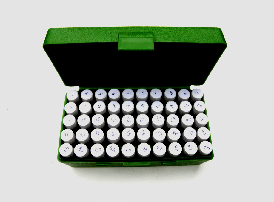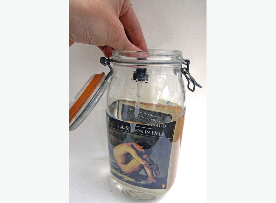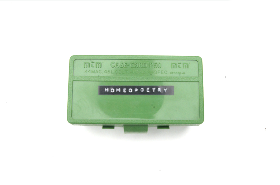 Green plastic case housing 50 vials containing sugar pills and the essence of 50 books.