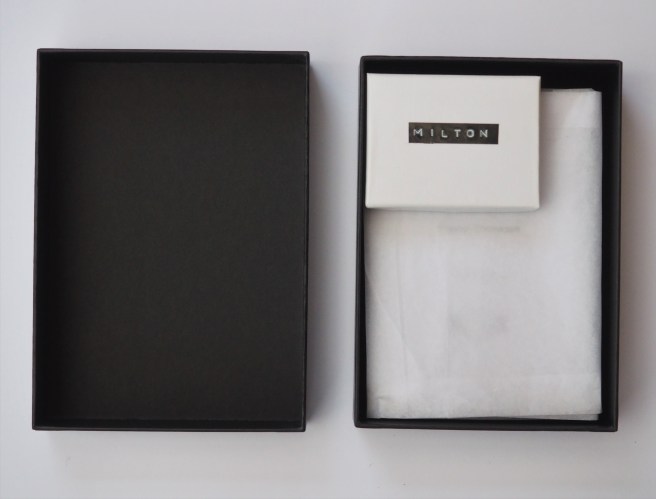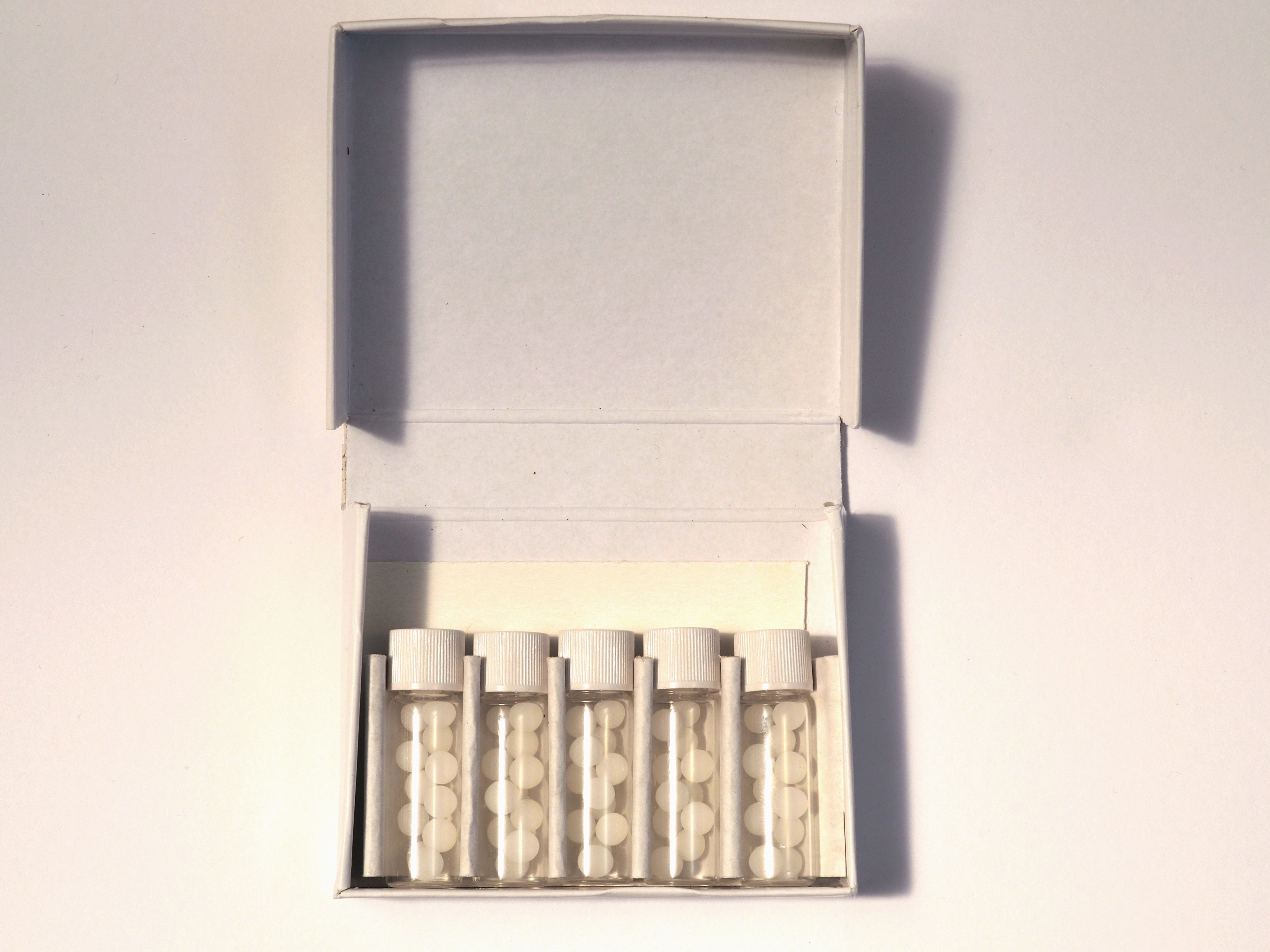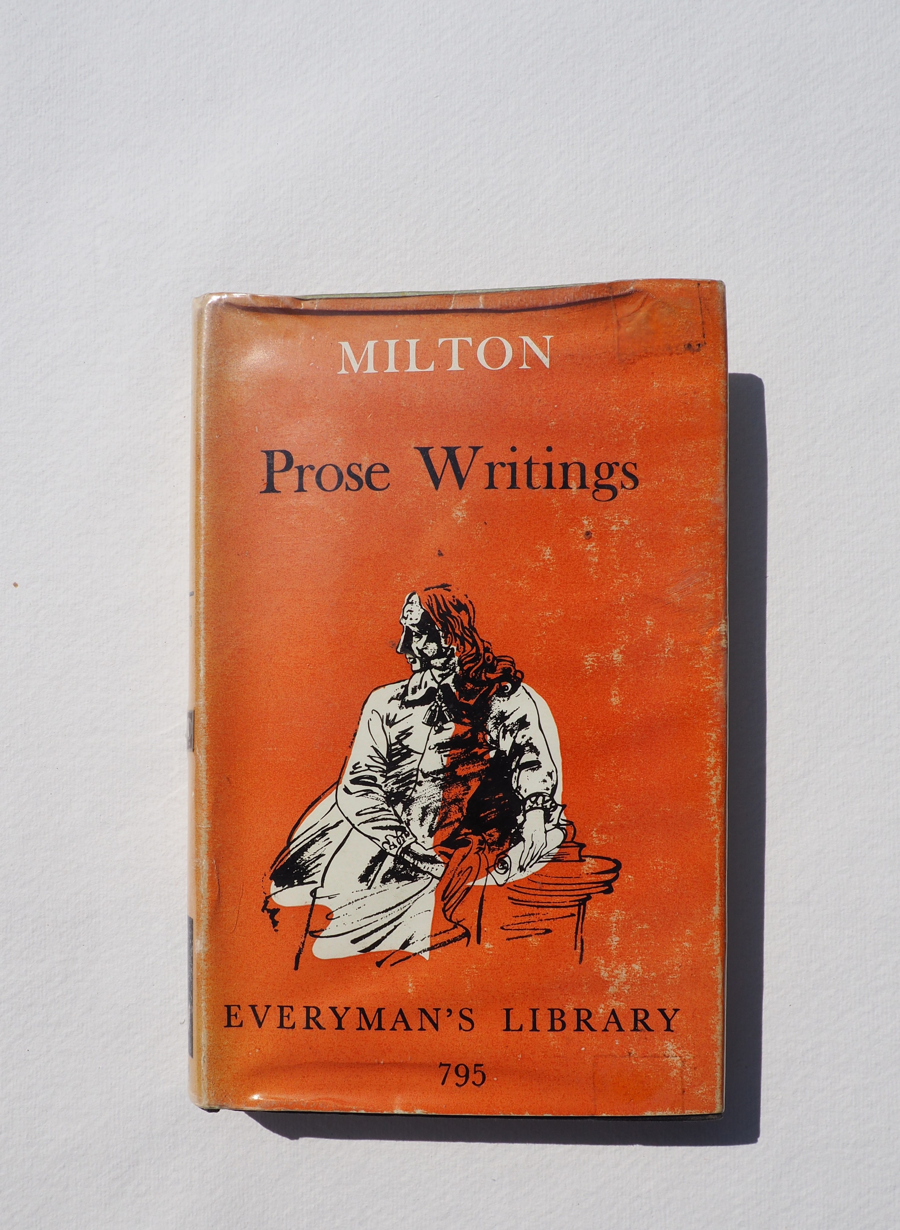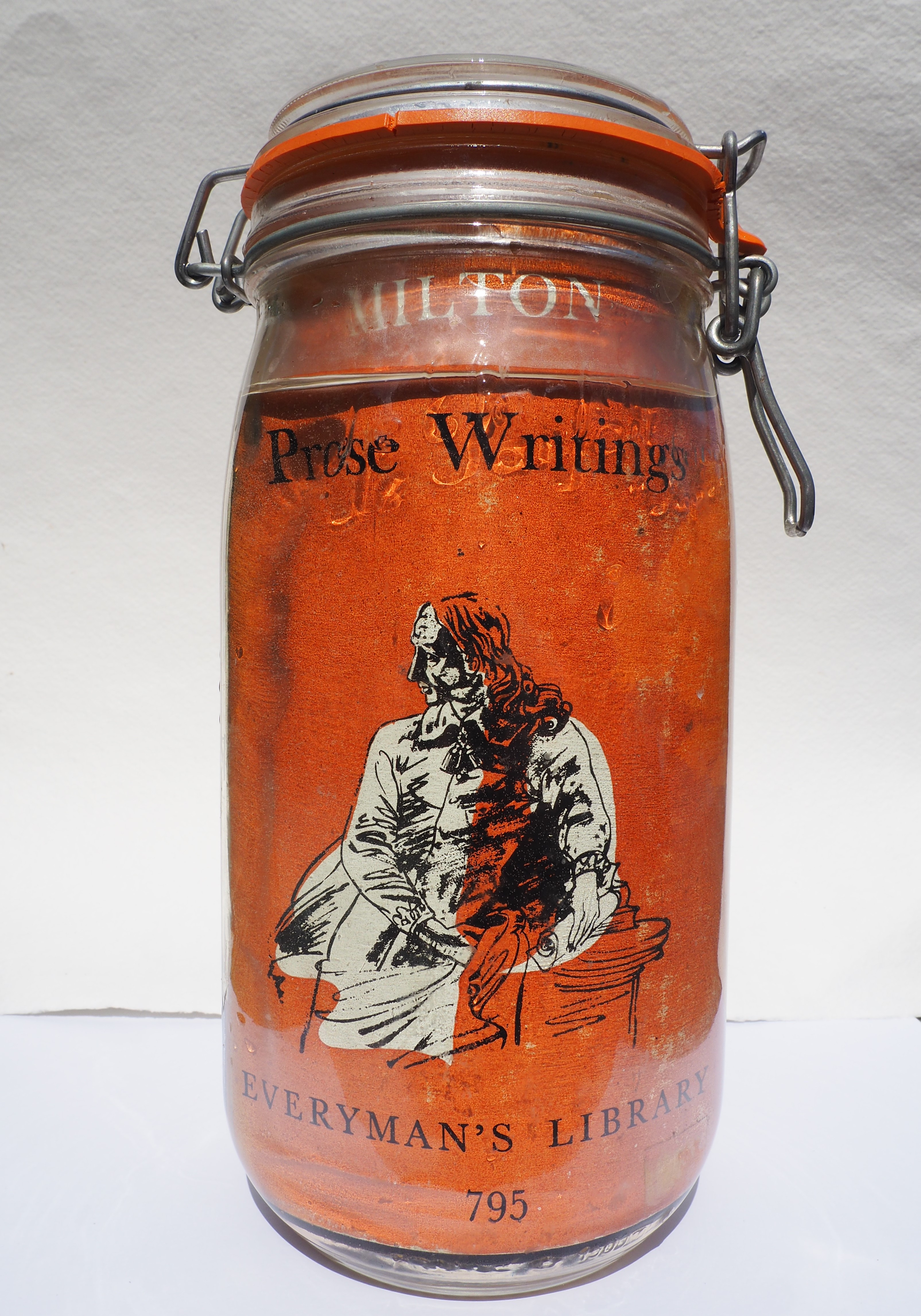 Black A6 presentation box containing 6 explanatory photographs and a smaller white box containing 5 vials of sugar pills imbued with the essence of Milton’s prose works.