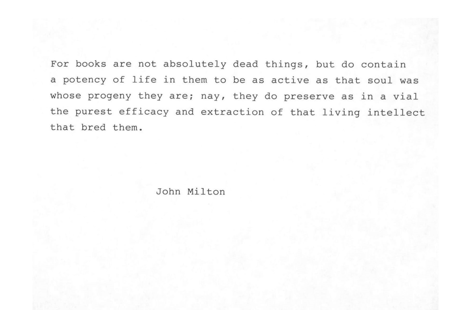 “For books are not absolutely dead things, but do contain a potency of life in them to be as active as that soul was whose progeny they are; nay, they do preserve as in a vial the purest efficacy and extraction of that living intellect that bred them.”