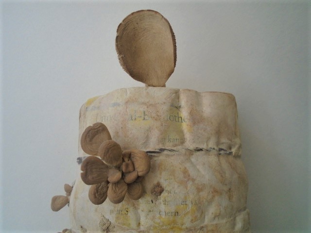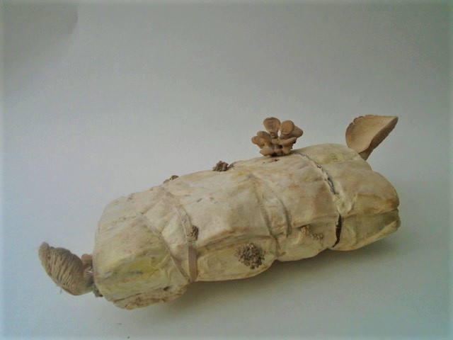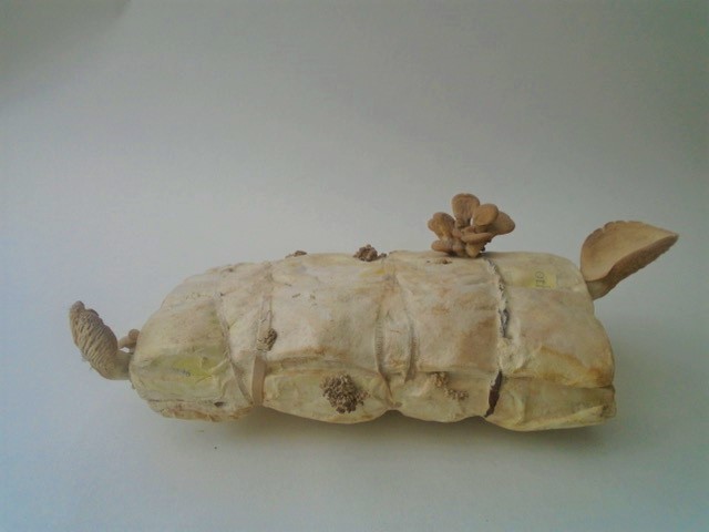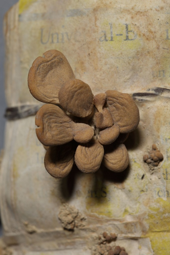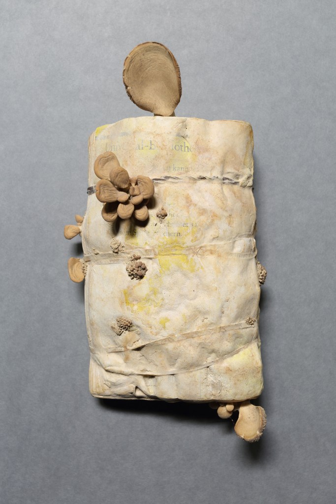 German language book with mushrooms growing out of it.